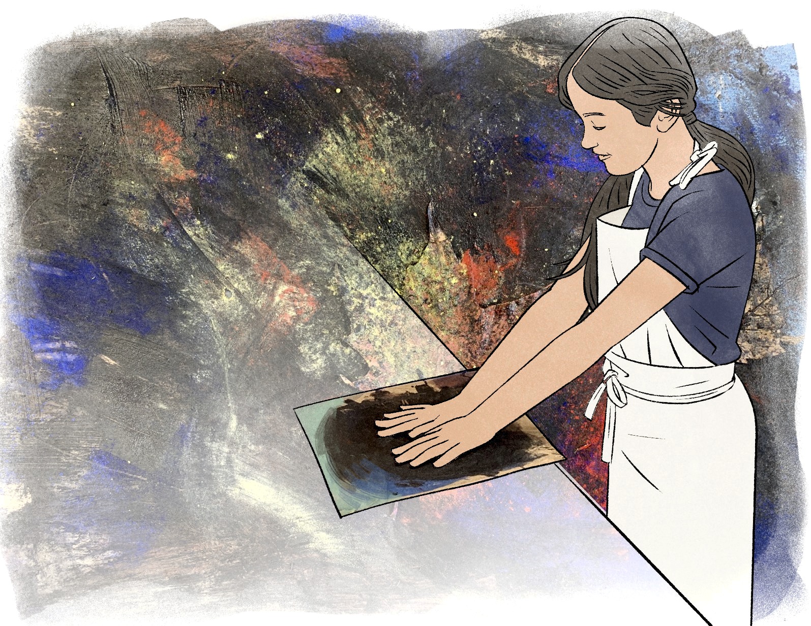 Elle avait en tout premier pris bien soin d'enfiler tablier et gants pour éviter de se salir. Et puis, après avoir copieusement inondé son œuvre de couleurs, après un temps d'arrêt, elle a résolument plongé ses mains nues dans la peinture fraîche!lire le billet ❯