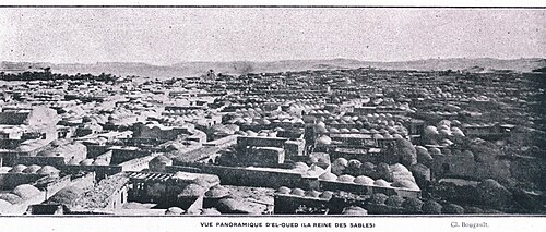 C’est ainsi que nous sommes arrivés le jour de Noël à l’oasis d’El Oued et nous sommes retrouvés  à 7 ou 8 dans un petit hôtel, dans la chambre d’un couple d’autres profs Anglais que mes collègues avaient rencontrés en début d’année. El Oued est une petite ville, surnommée la ville aux mille coupoles) qui s’étire, coincée entre une grande palmeraie et les très grosses dunes de la mer de sable l’Erg oriental.